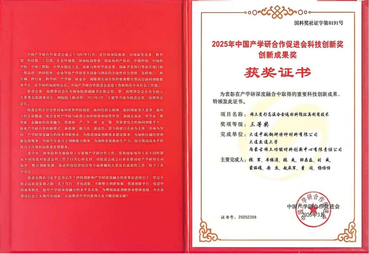 3月15日,第十七届中国产学研合作创新大会在北京举行,国家稀土功能材料创新中心(以下简称“国创中心”)联合大连中航钢研特种材料有限公司、大连交通大学共同研发的“稀土变形高温合金返回料循环再利用技术”,荣获创新成果奖三等奖。这一奖项的获得标志着我国在高端航空材料战略资源循环利用领域取得新突破,长期受制于人的“卡脖子”技术将有望被攻克。